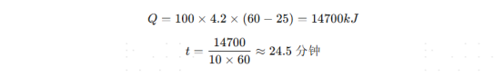 假設有100 kg水(c = 4.2 kJ/kg·℃),需要從25℃加熱到60℃,換熱器傳熱功率為10 kW,則: