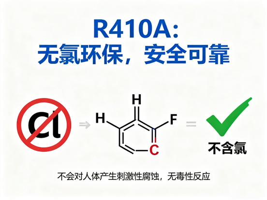 R410A不含氯元素,因此不會破壞臭氧層(ODP=0)。