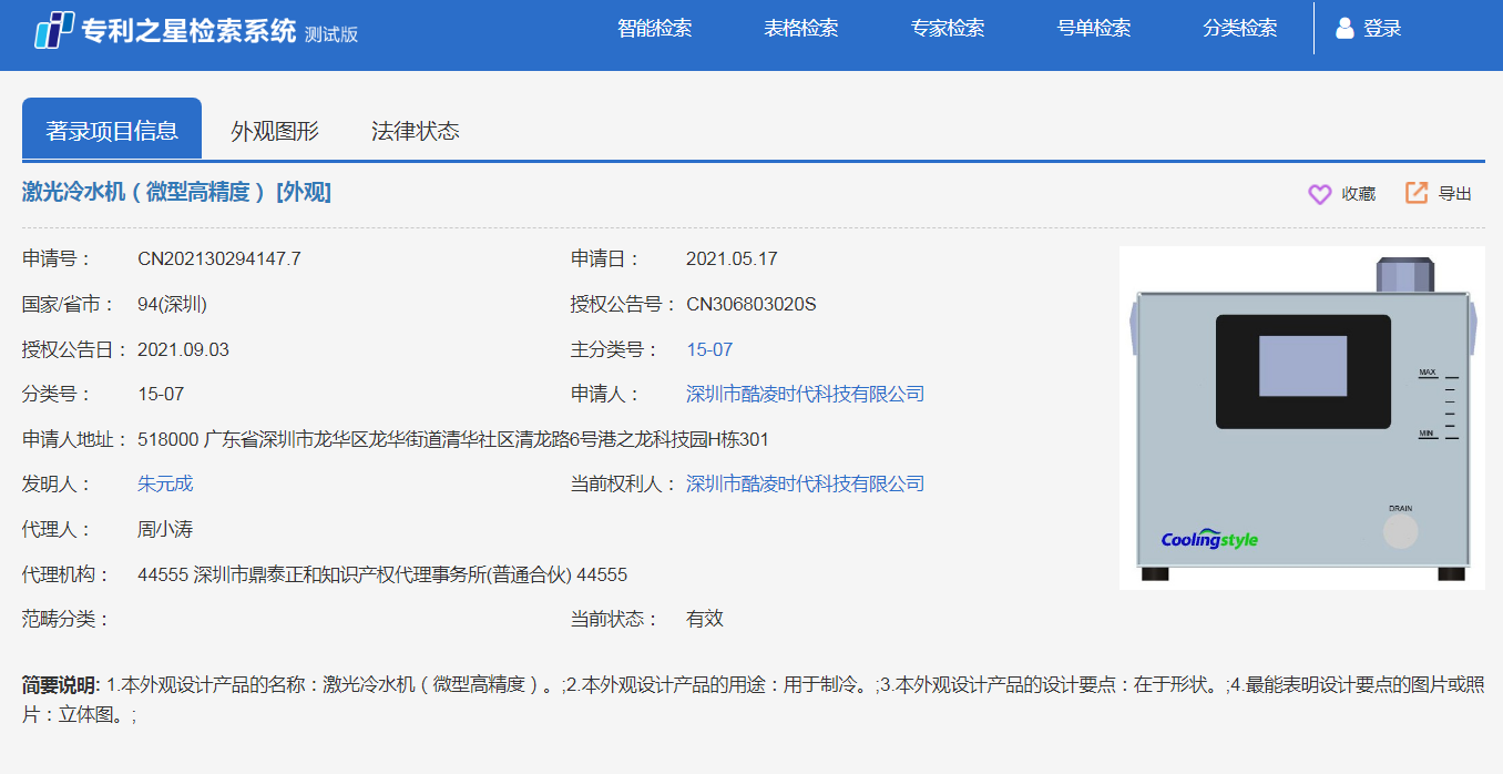 酷凌時代激光冷水機(微型高精度)外觀專利申請成功,已于2021年9月3日正式公告。