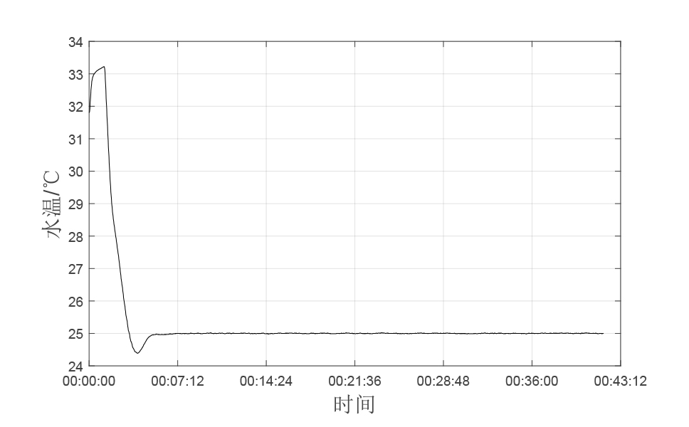 在實際工作過程中,Q420/Q580系列冷水機的溫控曲線如圖所示,可輕松實現±0.1℃的溫控精度。在工況相對穩定的情況下,溫控精度甚至可達±0.01℃。