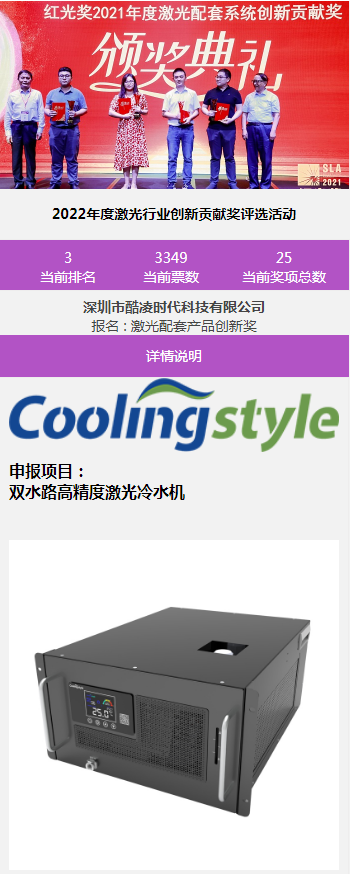 酷凌時(shí)代有幸再次入圍“紅光獎(jiǎng)”參選,申報(bào)獎(jiǎng)項(xiàng):激光配套產(chǎn)品創(chuàng)新獎(jiǎng),申報(bào)產(chǎn)品:雙水路高精度激光冷水機(jī),目前投票依舊在如火如荼的進(jìn)行中,每天都在瘋狂投票和拉票中!目前酷凌時(shí)代所申報(bào)的獎(jiǎng)項(xiàng)投票排名,位居第三。酷凌時(shí)代在此感謝每個(gè)支持和信任的客戶、親朋及好友們,感謝大家投出的每一票。