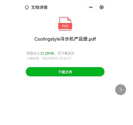 4,以下載 “Coolingstyle冷水機(jī)產(chǎn)品冊(cè)”為例,點(diǎn)擊“下載文件”;