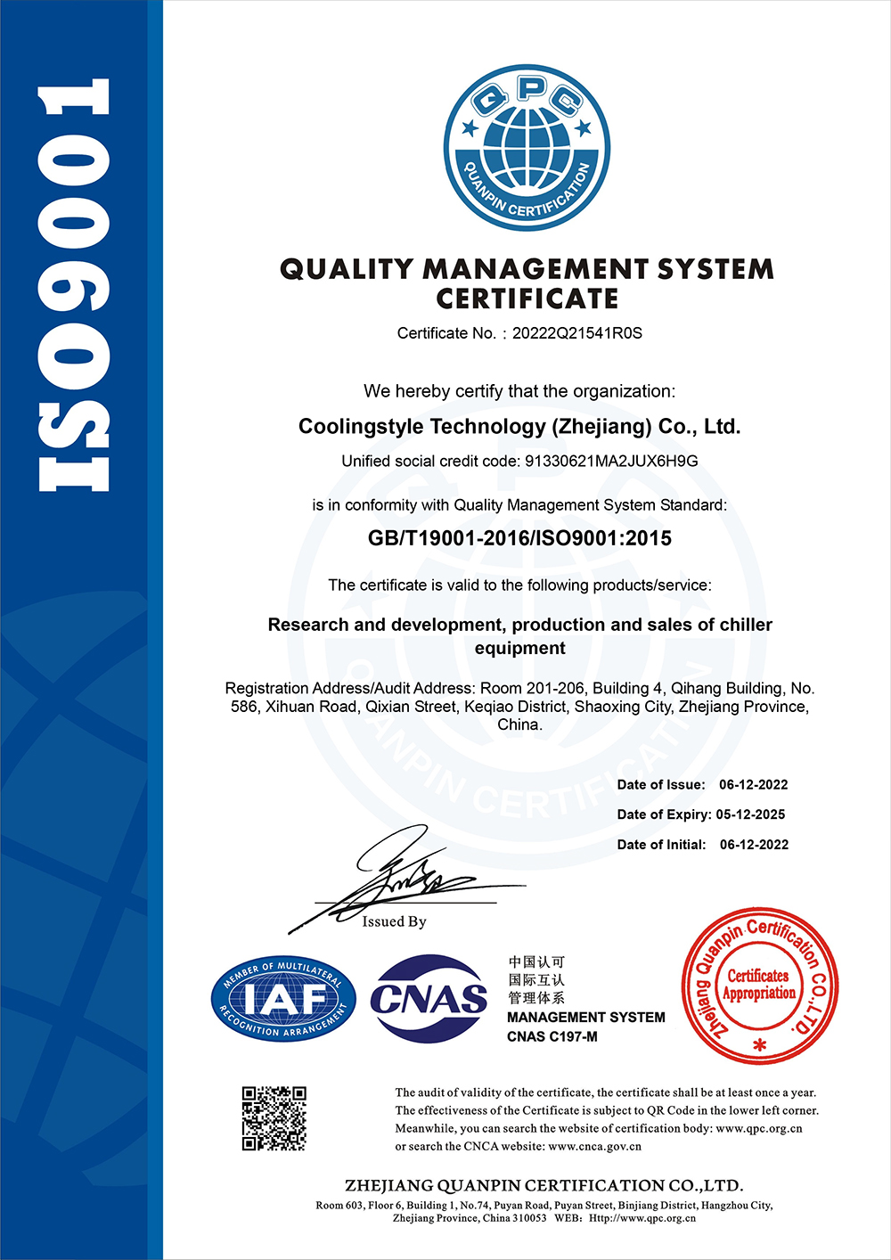 證書覆蓋范圍:冷水機設備的研發、生產和銷售