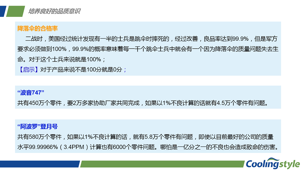 酷凌時代公司高度重視“品質(zhì)意識的重要性”,因此在新員工入職后第一課就安排了關(guān)于“質(zhì)量和品質(zhì)意識”的培訓。公司高度重視員工的作用,充分調(diào)動員工的積極性和創(chuàng)造性,最大限度地保證產(chǎn)品質(zhì)量、服務(wù)質(zhì)量和工作質(zhì)量??崃钑r代始終堅信:質(zhì)量是企業(yè)的生命,品質(zhì)意識是企業(yè)生命的靈魂。