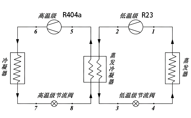 公司于去年承接了某特種需求——為四個不同區(qū)域提供-70℃低溫制冷,同時還需一定的制冷量。在單極蒸氣壓縮制冷系統(tǒng)中,常規(guī)冷媒的蒸發(fā)溫度最低只能降到-40℃,要達到-70℃,必須要用到復疊式制冷系統(tǒng)。