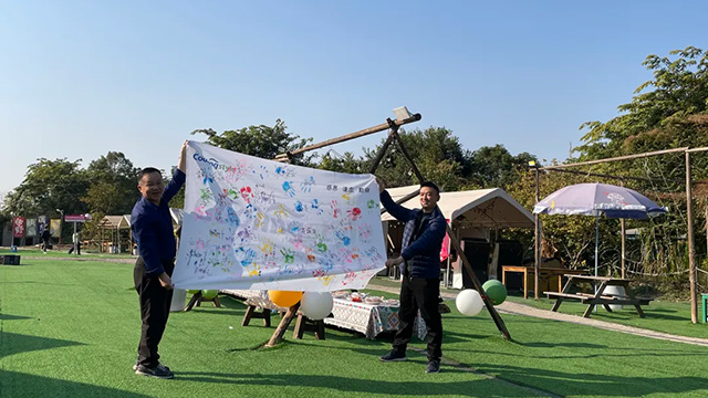 “簽到旗幟贈與環節” 充滿了儀式感。每位成員在旗幟上鄭重簽下自己的名字、蓋上手印,這不僅是對活動的參與,更是對團隊的承諾與擔當。當這面承載著眾人期望與信念的旗幟在大家手中依次傳遞,最終由陳總和冉總代表公司鄭重接過,那一刻,責任與榮譽的接力棒在團隊中無聲傳遞,將每一位成員的心緊緊凝聚在一起。