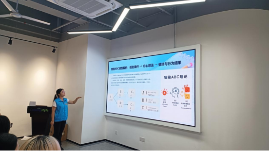 在正式的課程環(huán)節(jié)中,心理導(dǎo)師結(jié)合實(shí)際案例講解了“情緒ABC理論”,幫助大家理解情緒產(chǎn)生的原因與連鎖反應(yīng)。導(dǎo)師還教授了多種實(shí)用的情緒調(diào)節(jié)技巧——戰(zhàn)術(shù)呼吸法、60秒物理暫停、肌肉放松法等,幫助大家在工作和生活中學(xué)會(huì)快速平復(fù)情緒。此外,還引導(dǎo)員工嘗試“行動(dòng)重啟”策略:當(dāng)陷入情緒困境時(shí),不妨專注當(dāng)下、散步五分鐘或完成一件小事,重新獲得掌控感。