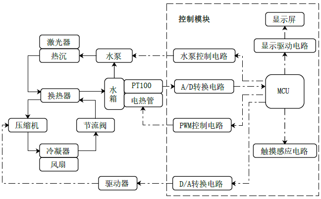 對于固定的系統來說,只需要保持水溫的穩定,就能確保激光器溫度的穩定。水的冷卻通過上述的制冷系統來實現,水的加熱可以通過布置在水箱內部的電熱管來實現。溫度傳感器將感應到的水溫信號經A/D轉換之后反饋給單片機(MCU),單片機根據當前實際水溫和所需目標溫度的關系,通過輸出電路來控制壓縮機和電熱管的工作,以實現水溫的穩定。在控制模塊中,還設置有顯示屏和觸摸感應電路,可實現人機對話。使用者可以通過控制模塊實時觀察到水溫以及溫度控制系統的工作情況,也能根據需要設定目標溫度。