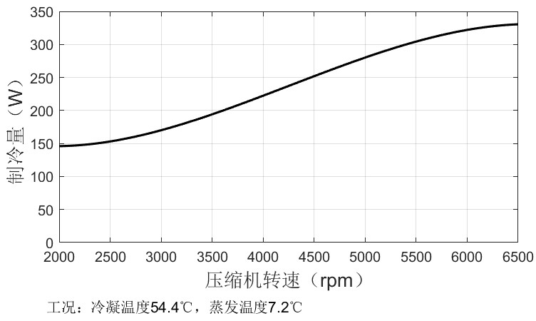 蒸氣壓縮式制冷是目前效率最高的制冷方式。常規的交流壓縮機只能通過啟停或熱氣旁通的方式來控制系統的制冷量或加熱量,可控性差且精度不高。本文采用直流變頻壓縮機,體積小、重量輕、效率高,最重要的是能在很大范圍內實現無極變速,轉速越高,制冷量越大,因此系統的制冷量十分可控。選定的壓縮機型號為CS-MCQ-19241100(圖2),該壓縮機重量約850g,直徑56mm,其制冷量和轉速的關系如圖3所示。
