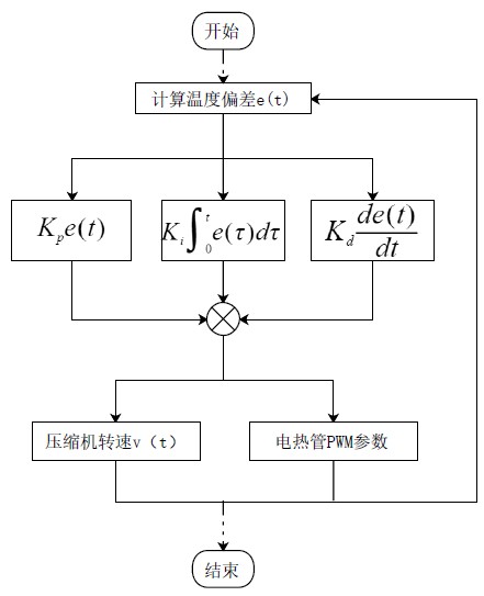 系統通過調節壓縮機轉速和電熱管開關的PWM參數,控制制冷量和加熱量,最終使水溫達到穩定。由于激光器的工作并不是穩定的,且環境因素的不確定性對制冷系統的影響很大,系統的結構和參數必須依靠經驗和現場調試來確定,因此無法用一個精確的數學模型來控制系統的工作。PID算法簡單、魯棒性好、可靠性高,是最適合本系統的控制策略之一,它根據系統的誤差,計算出比例、積分、微分控制量來調節系統的工作。PID的工作流程如圖4所示,在每個時間步長內,系統先對水溫誤差進行計算,再對誤差進行PID計算,然后得出壓縮機轉速和電熱管功率的調節量。如此反復進行,直至溫度誤差控制在精度要求范圍內,此時水溫達到穩定。P、I、D參數對系統性能的影響很大,工程上一般依靠經驗并結合試驗的方法對其進行整定。本文采用臨界比例度法進行PID參數整定。