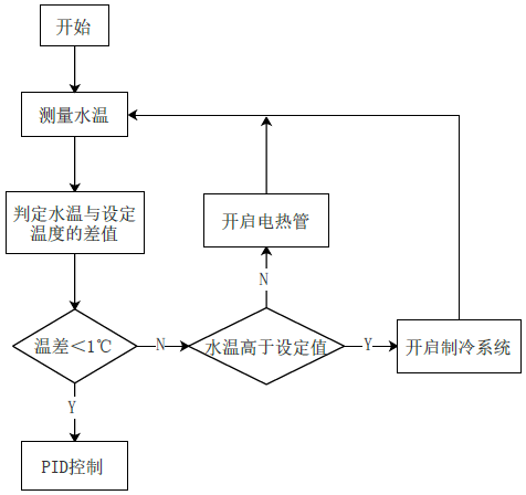 系統控制流程如圖5所示。當系統剛開機時,若水溫高于目標溫度1℃以上,則開啟制冷系統,使壓縮機全速運行,將水溫快速降低;若水溫低于目標溫度1℃以上,則滿功率開啟電熱管,使水溫快速升高。當水溫進入目標溫度±1℃范圍后,采用PID算法對壓縮機轉速和電熱管功率進行實時調控,最終使水溫穩定。