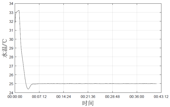 對某型號10W紫外激光器進行了溫控試驗。采用了前文所述的制冷系統、電熱器件等功能單元及控制算法,系統循環水量僅1L。設定目標溫度為25℃,激光器和溫控系統同時開啟,圖6記錄了系統從開機到穩定的水溫變化全過程。