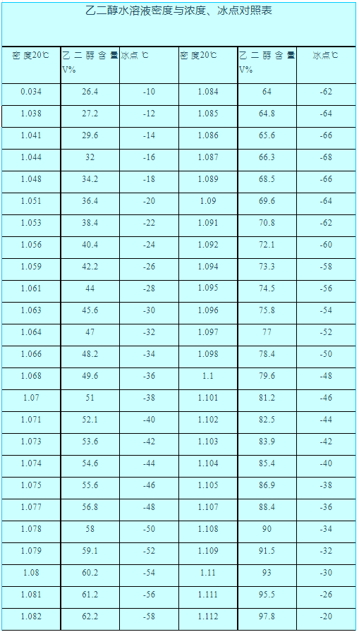 ,下面給大家推薦一種我們常見的防凍液乙二醇水溶液,關(guān)于它們之間的配比,密度與濃度及冰點(diǎn)的對照表,具體如下: